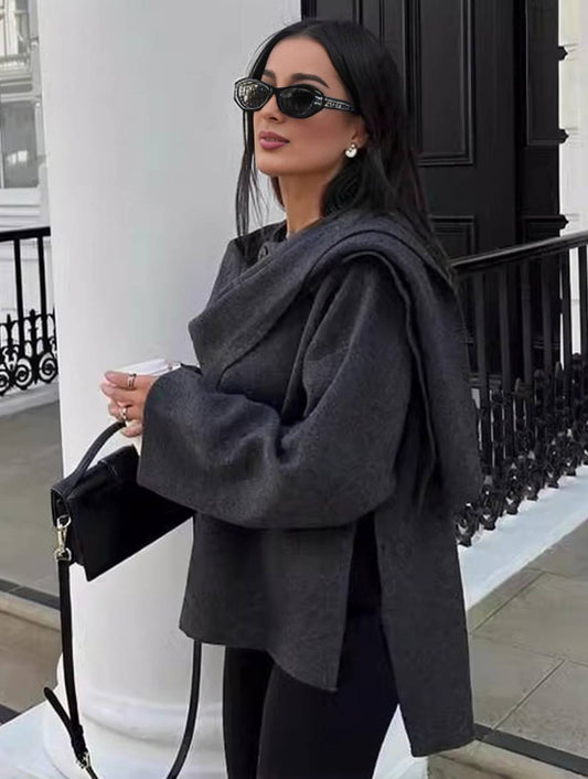 Cocolii manteau en laine avec écharpe fendu le côté boutons col rond manches longues femme élégant décontracté lâche veste