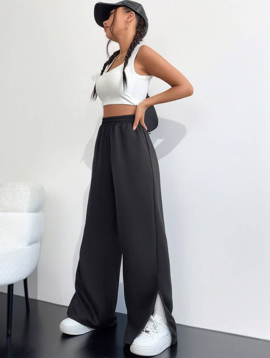 Cocolii pantalon larges jambes évasé fendu le côté taille haute femme casual ample décontracté