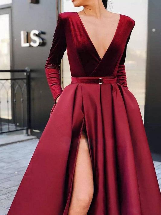 Cocolii robe longue flanelle v-cou fendu le côté ceinture manches longues femme élégant de soirée bal de promo