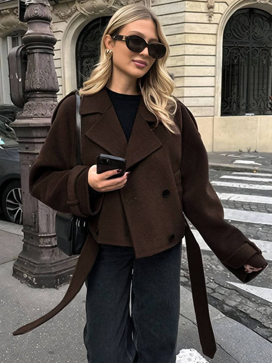 Cocolii court manteau en laine double boutonnage ceinture col revers femme élégant décontracté veste caban
