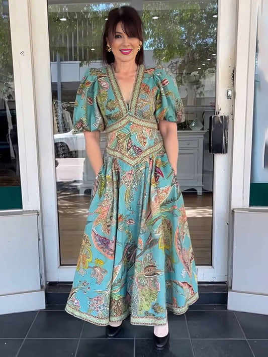 Cocolii robe longue v-cou imprimé à fleurie fluide manches courtes élégant femme médiévale vintage bal de promo cérémonie