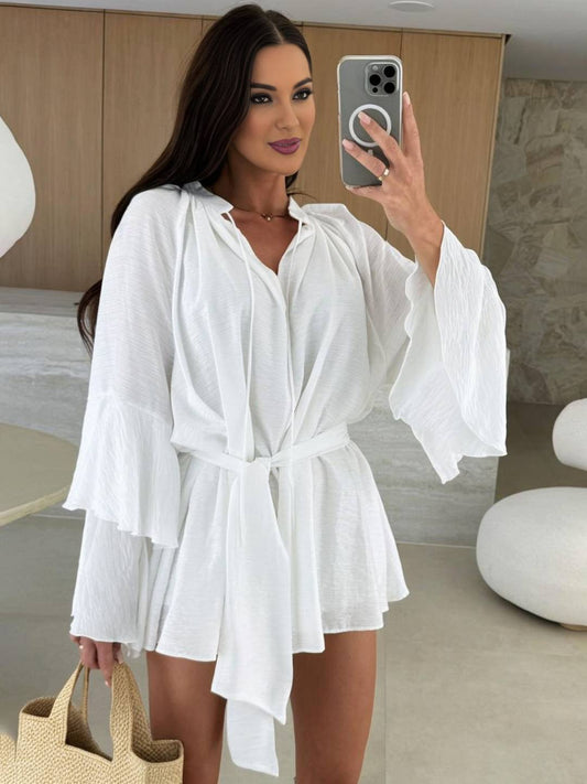 Cocolii mini robe v-cou ceinture irrégulière manches trompette manches longues femme casual bohème décontracté de plage