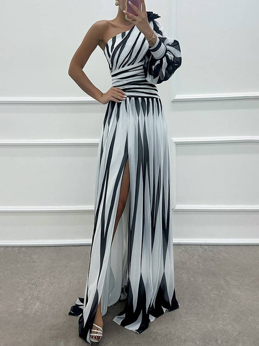Cocolii robe longue imprimé zèbre fendu le côté fluide une épaule femme élégant de soirée bal de promo