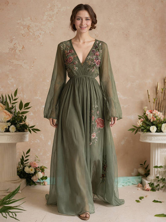 Cocolii robe longue mousseline imprimé à fleurie fluide v-cou manches longues femme décontracté vintage soirée de plage