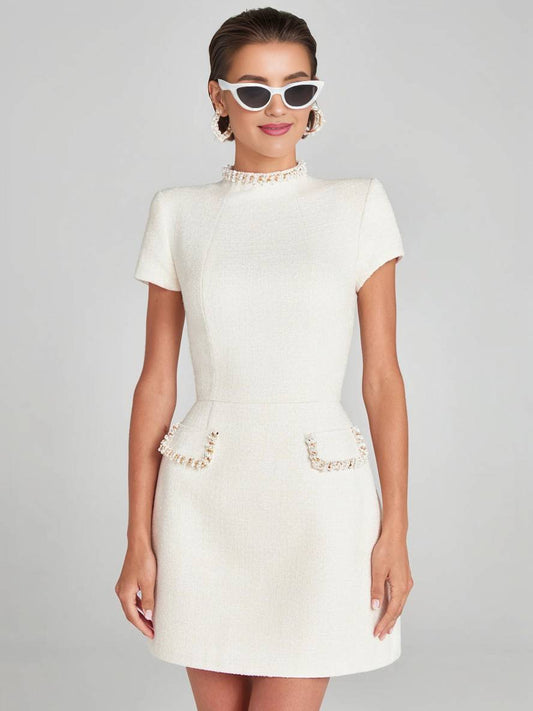 Cocolii robe courte tweed col roulé manches courtes poches femme style tailleur élégant de soirée pour mariage de cocktail