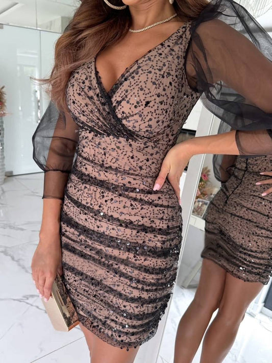 Cocolii kurzes eng anliegendes glänzendes Paillettenkleid V-Ausschnitt lange Ärmel Tüll Damen elegant Cocktailkleid Abschlussballkleid