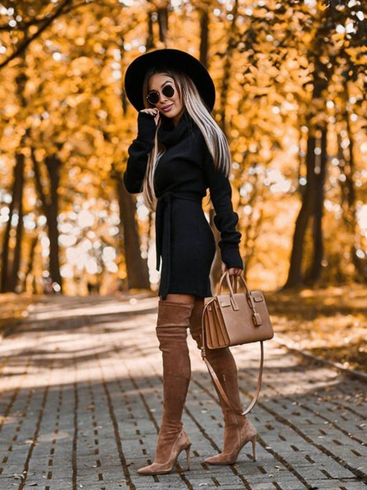 Cocolii kurzes eng anliegendes Kleid Rollkragen Langarm Damen elegant lässig casual Cocktailpullover Kleid