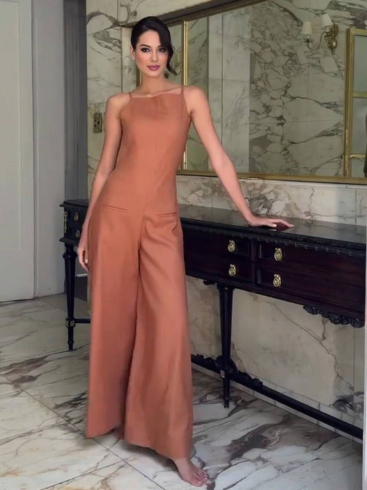 Cocolii combinaisons larges jambes évasé lin dos nu à fines brides sans manches élégant décontracté style vacances pour femmes