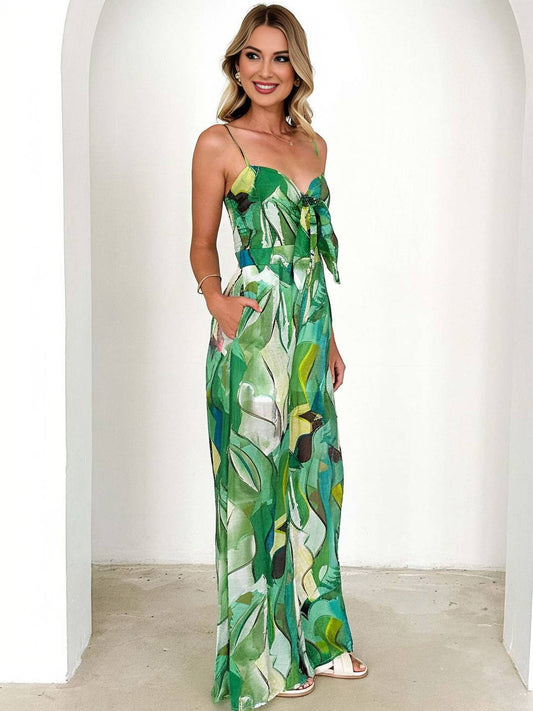 Cocolii combinaisons larges jambes évasé imprimé à fleurie noeud papillon à fines brides sans manches femme casual décontracté