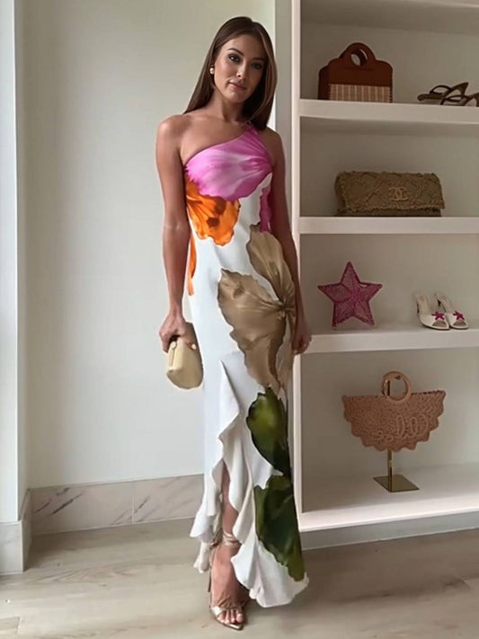 Cocolii langes Kleid mit einer Schulter, geblümtem Druck, seitlichem Schlitz, unregelmäßig mit Volants, ärmellos, elegant für Abendveranstaltungen und Zeremonien