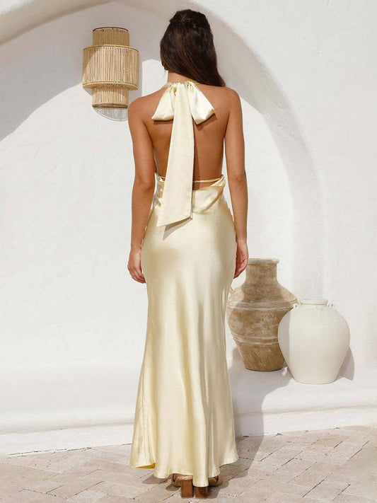 Cocolii langes Kleid aus Satin mit V-Ausschnitt, Neckholder, rückenfrei, ärmellos, elegant, lässig, Abendkleid für Hochzeit Zeremonie Frau