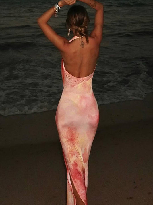 Cocolii langes Kleid mit Blumenmuster, Neckholder, seitlichem Schlitz, rückenfrei, tief ausgeschnitten, ärmellos, lässig, Boho-Strandkleid