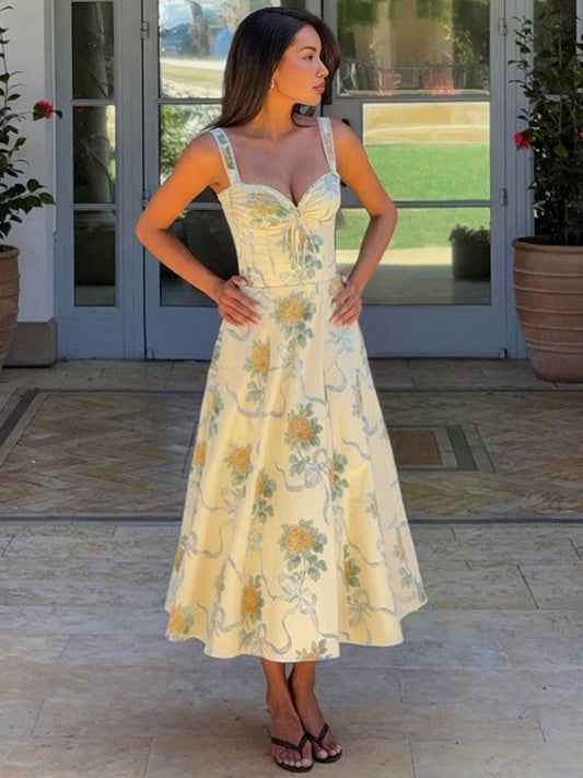 Cocolii langes trapezförmiges Kleid mit Blumenmuster, V-Ausschnitt, dünnen Trägern, rückenfrei, ärmellos, weich, vintage, Abschlussball, Geburtstag