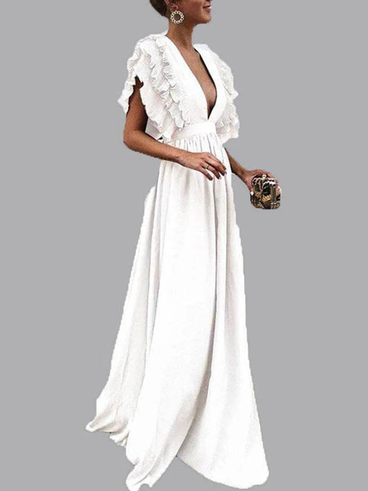 Cocolii langes Kleid mit seitlichem Schlitz, Volants, Rückenausschnitt, V-Ausschnitt, ärmellos, elegant, Strandzeremonie für Damen