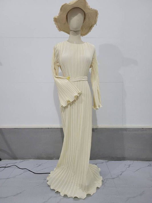 Cocolii langes fließendes Kleid Gürtel Rundhalsausschnitt Trompetenärmel Damen elegant Abschlussball