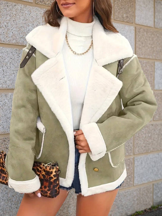 Cocolii Jacke Flieger Damen Fleece gefüttert Taschen klobige Schnalle Reverskragen lässig warm Mantel aus Wildlederimitat