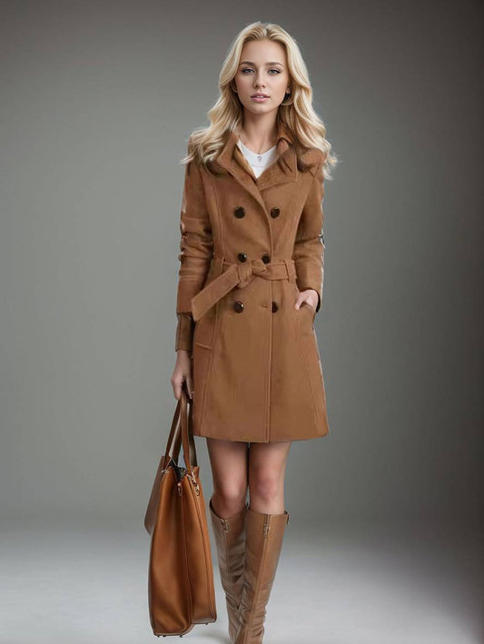 Cocolii mittellanger einfarbiger Mantel mit doppelter Knopfleiste Gürtel lange Ärmel Damen elegant lässig