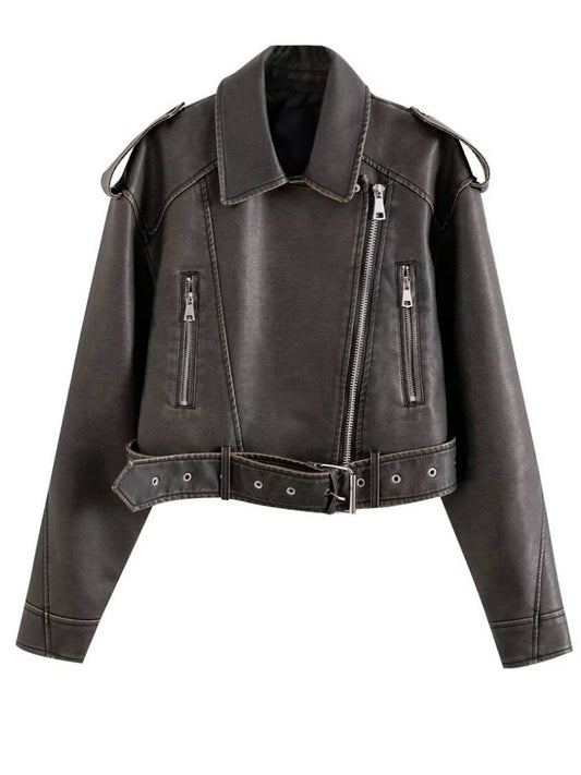 Cocolii court perfecto femme cuir fermeture éclair poches ceinture grosse Schnalle Reverskragen femme lässige Jacke